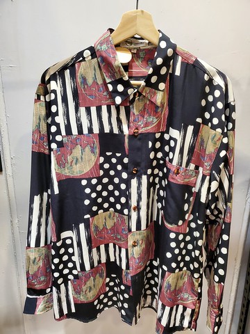 日本古著 涼感 絲質 拼接圖騰 長袖襯衫 L號 近全新