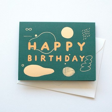 生日快樂卡 - 綠色/金色● 原畫為手繪作品● 雙色燙金印刷● 尺寸 4.25x5.5 英吋● 內頁空白,無印刷● 附贈同款信封● 270gsm 亞麻紋理紙● 裝於透明塑膠套內,附紙板保護,防止摺痕螢幕顯示顏色可能略有差異。© 2020 by Pianissimo Press 保留所有權利。未經 Pianissimo Press 書面許可,禁止以任何方式重製或修改圖像。