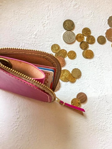 不撞包桃紅色植鞣革全真皮L型拉鍊零錢包/短夾