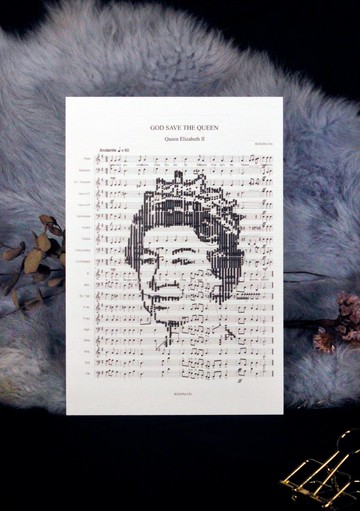 **樂譜明信片-英國女王**【關於樂譜明信片】用音符拼湊出的圖像樂譜,背景音樂是英國國歌,有趣的是,英國當君主是女王時歌詞就是God save the queen,當君主換是國王時,歌詞便會改為 God save the king,後面可以寫字的地方是五線譜的橫條紋,你也可以成為音樂家~背後的網址可以連結到作者網站,觀看錄像作品喔!--------材質:瑞典300P一級卡11x16cm【關於錄像作品】Peggy KUO 是結合設計、音樂與藝術等跨領域的藝術創作者,2012年開始發展《聲音肖像》系列,作品用音符拼湊出圖像化的視覺圖案,用錄像裝置的方式呈現,看起來就像是失調的樂譜,當影像中的時間軸碰觸到畫中人物的部分,會因為繁複的音群堆而產生吵雜而不悅耳的聲音,從樂音記譜的規則裡產生非邏輯性的噪音,如同檯面上的政治人物,在看似規則的狀態下又是一個不合理的政治生態。Peggy KUO 更是將圖像樂譜帶進音樂廳演出的藝術家,其設計的周邊商品,結合音樂藝術與新媒體的元素,將藝術帶入生活,是隨時能分享給朋友的美好事物。 https://youtu.be/1mgK1GAFY3g