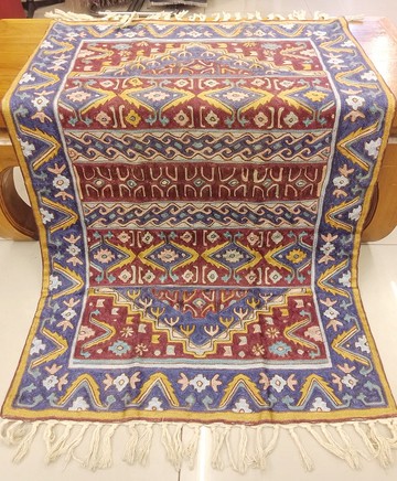 ▌來自喀什米爾的刺繡地毯來自人間仙境——喀什米爾的工匠以 Chain Stitch 的技術,純手工編織的絲質地毯,每一張都獨一無二。喀什米爾單線鏈式刺繡毯,以稱作鎖鏈刺繡 (Chain Stitch) 的傳統工藝製成。由鉤針在白色底布上刺繡而成,當地也稱為 Aari。這種刺繡的速度比針線刺繡來的快,成品帶有浮雕的效果。由喀什米爾雙手帶有魔法的工匠手工完成,帶有鮮豔的色彩和中南亞異域風情的圖樣設計風格非常有特色。為了增加織品的豐富性,會使用羊毛、亞麻、絲和棉等天然纖維製作。但不論什麼材質,鎖鏈刺繡 (Chain Stitch) 的技法可以將任何簡單的質地轉變為最絲滑的觸感,並帶有令人驚嘆的光澤。完成的地毯主題受蒙兀兒歷史影響,多為對稱的幾何或是花卉圖樣,刺繡在白色的底布上,為居家織品提供沉穩而充滿巧思的設計感。精緻的地毯也展現了喀什米爾古老嫻熟的傳統藝術。Chain Stitch 的刺繡毯與一般地毯的不同處在於以刺繡完成,比起常見的波斯地毯能有更小的尺寸及輕量,收納起來也方便。背面底布為棉布材質,不像傳統的地毯這麼厚重,作為牆面掛飾或是沙發裝飾、床旗、桌旗都可以。此款為中小尺寸( 121cm * 76cm)的地毯,適合放在客廳沙發茶几前、臥室中央,或是居家牆面的點綴掛毯。選一張喜歡的圖騰,為春天的家居佈置帶來新的氣象吧✨【商品規格】・ 產地:喀什米爾・ 121cm * 76cm・ 單面蠶絲刺繡,另外一面是素面的・ 純手工編織地毯,清潔時可以濕擦髒污處,建議使用中性洗劑手洗💫注意事項・ 每張照片都是老闆在店內黃光實品拍攝,但顏色可能因不同顯示器而有些許差異,請多多體諒。・ 地毯都是喀什米爾匠人手工編織,可能會有不同程度的手工痕跡,也代表著您拿到的地毯是這世界上獨一無二的。