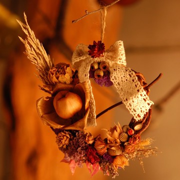 設計理念-在西方傳統中,聖誕節這一天,會將檞寄生掛在門上及門楣上,如果兩個人同時經過掛在門楣的檞寄生下,就要互相親吻對方,傳說在槲寄生下接吻的戀人會廝守終生喔!用木玫瑰永恆的象徵,祝福大家都能擁有幸福快樂!創作過程-木玫瑰為主要花飾,搭配各種乾燥花材、果實、蕾絲緞帶,鑲在一圈一圈纏繞的柳枝圈上。不論是掛在房間門上、床頭櫃上或是書桌前,就算聖誕節過啦~這繽紛的秋收果實也能帶給大家一整天的好心情!商品規格尺寸-總長約15cm總寬約15cm木玫瑰朵數/1朵搭配乾燥花材/麥稈菊、新娘花、琥珀果、卡斯比亞、星辰花、月桃果、青剛櫟、薰衣草、玫瑰(乾燥花材種類及擺放位置皆會有些許微調,依實際商品為準)搭配包裝材/復古蕾絲、本色麻繩、紙絲、透明盒小提醒-木玫瑰只要不重壓摔落可以維持此型態10年以上喔。乾燥花材因碰撞搖晃有些許掉落是正常現象。擺放位置請盡量避免於潮濕處(浴室/廁所等)以利增加商品保存品質。放置時間較久可能會有灰塵,用軟毛筆刷/吹球將灰塵輕刷/吹掉即可。產地/製造方式產地台灣 手工製作