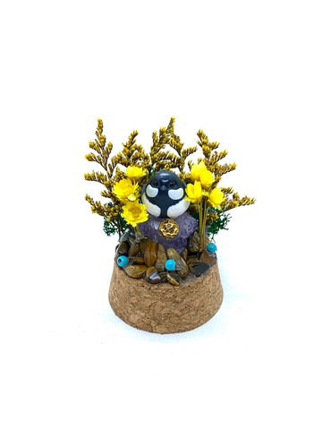 綠色森林。白頰山雀與紫水晶紫水晶(Amethyst)增加智慧、提升靈性希臘天神巴斯卡有一次喝醉,準備將一名路過的美麗少女當做其老虎寵物的點心。驚慌失措的少女在情急之下,祈求月亮女神黛安娜保護,於是黛安娜就將少女Amethyst(紫水晶)變成一顆純潔的石頭,躲過了老虎的追捕。此時天神巴斯卡頓然清醒,將手中的葡萄飲品潑撒在石雕上,將之渲染成紫色。為彌補自己犯下的錯失,天神以少女的原名「Amethyst」命名紫水晶。*****商品製作*****底台製作時是以虎眼石碎石鋪墊,虎眼石(tiger’s eyes)有幫助果斷與果決的力量、增加勇氣。*****手作奧秘空間*****品牌故事:在每一個小玻璃空間中,不同的時空與背景,構成不同的故事,在不同的觀看者眼中,形成一個獨有的奧秘空間。商品理念:因為喜歡扭蛋,每當打開扭蛋外殼看到喜歡的公仔,就會想像著那個他自己的獨特空間,編織他們的故事,因此激發了想在小小的玻璃空間創造一個屬於他們的場景。*****內容物*****公仔:四十雀/白頰山雀水晶底台:虎眼石水晶 :紫水晶馴鹿草永生苔蘚乾燥花 *****尺寸*****直徑5cm x 高度 7com*****注意事項*****玻璃罩不建議經常打開。因其使用之材質(乾燥花及馴鹿草永生苔)較軟,打開玻璃罩會些許掉落。如打開玻璃罩需裝回可稍微內壓苔蘚處,以倒立的方向裝回,切勿太大力避免場景損毀。請注意以下事項 ^_^1.目前未提供客製化服務。2.每一項商品手工製作只有一件。3.因為商品已製成,場景材質無法更換。IG:@eso.space7FB:@esoteric.space7
