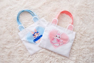 小手袋,簡單出門買東西或是東西很少的時候很需要的輕便包包不過這款!他!有耳朵!豪可愛!!!非常私心的,耳朵款!看到有耳朵就失心瘋,覺得一定要出這款商品的哞咪真心推薦!圖案印上了哞咪好喜歡好喜歡的洋裝兔兔系列背面畫上蝴蝶結跟尾巴小屁屁!因為正面有小耳朵呀!顏色一樣做了兩色,定番的粉紅與粉藍,可以看今天的衣服搭配尺寸:高24cm x 寬29cm