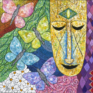 臉譜繪畫《自然流動 1》Contemporary Mask Painting - Flow Of Nature 1在這系列畫作中,有許多類似民俗臉譜或原始面具的人臉圖像,他們全都閉上眼睛,打開心靈之眼,讓視覺之外的感官自然流動。在人臉圖像的周圍環繞著許多圖騰,如海浪、森林、太陽、月亮、雲彩、山脈、岩石、花朵、宇宙等自然元素,象徵當我們專注於本心,全然投入,暫時放下現代化社會的人造事物,與原始單純的自己及能量連結。作品是由畫刀所繪製完成,您可以發現許多有趣的紋理及有別於畫筆的立體效果。閉上眼,隨著所有感官自然流動,試著往內在尋找、聆聽、自省,專注於 一個讓自己全然愉悅的狀態,讓身體與內心結合。您會發現許多不曾留意的 感受,有如跳著圓舞曲的小精靈叮叮噹噹地圍繞四周,一股源源不絕的力量 讓我們忘了本身及身旁的一切,有些像東方智慧中禪的境界,亦像我們成為 自己相信的樣子,一種真摯的滿足與喜悅由內而生。 尺寸:80 x 80 cm媒材:畫布、壓克力顏料**所有電腦和手機的顯示顏色都不相同,畫作可能與您在屏螢幕上看到的圖像顏色略有不同。**