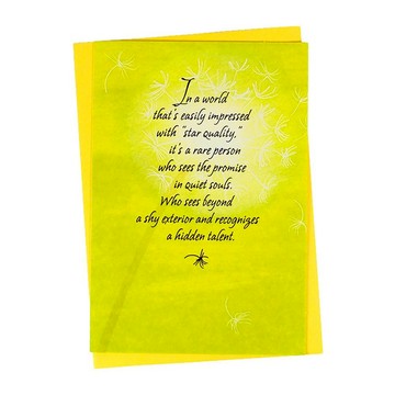 https://live.staticflickr.com/65535/33939197768_2a7ce14aec_o.jpghttps://live.staticflickr.com/65535/32872577087_5f712a4ef0_o.jpg品牌介紹:\t由設計師創作的印刷高品質卡片本卡片內含20%再生紙材質 請放心使用,與您一起珍惜地球資源為您翻譯內文:這世界容易對"明星特質"有深刻印象,是因有高人能看見無聲靈魂的堅定,看穿羞澀的外殼中蘊藏著天賦.高人,慷慨之人,難忘之人...就是您.【商品規格】平放未展開:11.9 x 17.3 cm設計國:美國材質:紙張※商品尺寸皆為平放測量以公分為單位,手工測量難免會有些誤差※商品圖檔顏色因電腦螢幕設定差異會略有不同,以實際商品顏色為準,敬請見諒