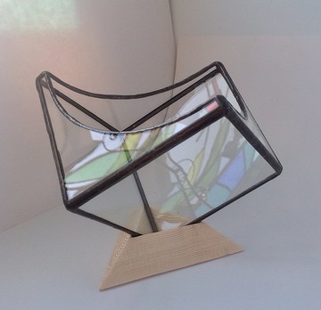 玻璃冷作鑲嵌工法中以銅箔包覆玻璃元件邊緣運用錫的低熔點,在不傷及玻璃前提下焊接組裝這樣的工法流傳已上百年面對工藝我們的訴求只有一個:** 扎實確切的執行每一個階段的細節** 一件作品經過為數多少道步驟而成不是我們關心的地方也說不出到底要〝算〞是多少步驟確實知道的事實是:**只要疏忽任何一個細節****就達不到應該有的質感與品質****只要偷懶跳過一個繁雜瑣碎卻少不得的動作****拿到藏家手上的作品就會不對勁**玻璃工藝是可以生活化的這裡指的是您可以藉由撫觸把玩讓玻璃確切的進入生命體驗中玻璃易留下指印卻仍晶瑩剔透硄啷易碎卻又堅實清亮您可以對它又愛又恨,畢竟連我們也都覺得它很難搞^^|||而舉目望去最先看到的是玻璃窗還有玻璃杯、玻璃瓶、玻璃桌面、玻璃鏡子..........當您生活周遭已經少不了玻璃的存在又何妨再多接納一個經過精心設計製作的工藝品~^^~多面體玻璃鑲嵌花房的美感,建立在精準度精準的玻璃切割精準的邊隙控制精準的組裝焊接精準的手工追求而原本多以平面置放的多面體玻璃花房我們將其增加以幾何稜線交會點為〝立足點〞的選項讓斜角切面開口的花房得以站著而非躺著增加容器的可用性也對器物的趣味加分我們試圖以複合媒材的方式中和一點玻璃的冷冽同時也試圖以複合媒材的方式讓多面結構的玻璃容器有著隱藏了動態的平穩** 執著,永遠呼應品質** **手工製作玻璃鑲嵌花房、原木製臺座****材質:鈉玻璃,63%錫(染黑),紅銅箔,原木****材質:鈉玻璃,99%錫(原色),紅銅箔,原木**玻璃物件:任一面平放10*10*10(寬*長*高)公分 木臺座置放14.7*14.7*12.5(寬*長*高)公分原木臺座10.6*24(正三角形邊長*高)公分***商品有錫原色(銀白)與染黑二款*****商品不包含圖片中植物哦~*****原木座屬天然材質,隨機出貨不挑木紋哦~**