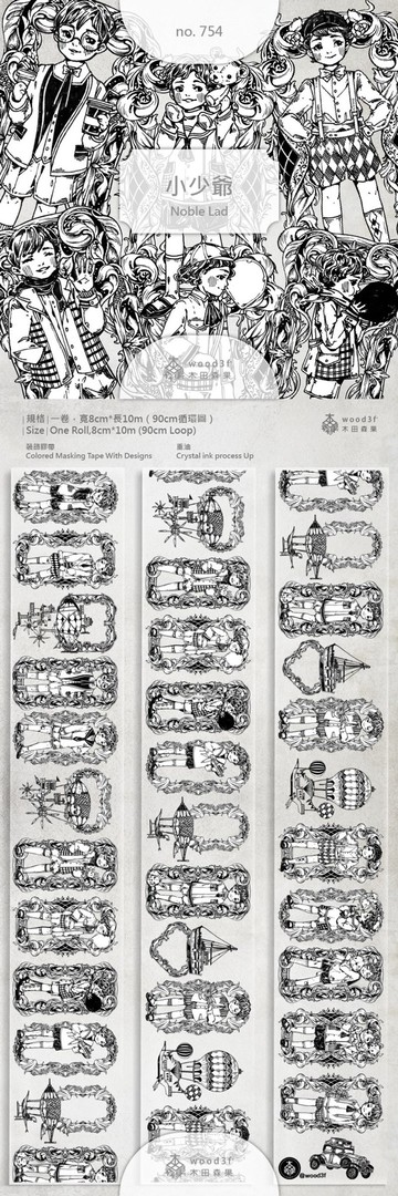 小少爺 Noble Lad品牌:木田森果型號:754一循環:8X90CM整捲:1000CM印刷工藝:印刷 + 白墨 + 重油# 木田森果 #小少爺 #手帳膠帶 #拼貼素材 #文創好物