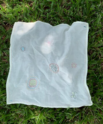 季節的改變很愛用領巾用色鉛筆畫了草稿仔細畫下線條希望圖能精準些40cm方領一個方型虛線6朵花6種線條虛線 實線 密縫白陽是白日與陽光一點點縫縫出一個面一條線一點盼望材質:雙層棉布尺寸:40×40cm