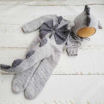 帶帽子的白色/灰色蓬鬆新生兒連身衣。寶寶拍照道具。
