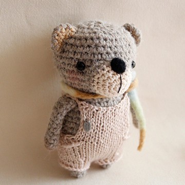毛線娃娃 手作玩偶 羊毛氈 莫蘭迪色吊帶褲圍巾寵物 灰色小熊