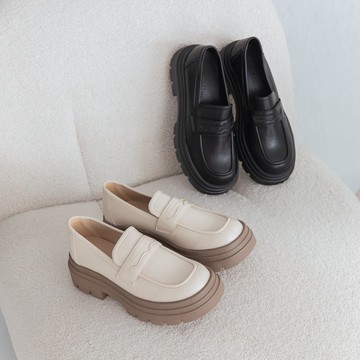 【88%】厚底小皮鞋 一腳蹬樂福鞋法式復古英倫風單鞋 學生皮鞋 2色