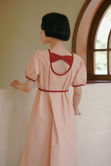 夏日奶油粉 日系後背蝴蝶結燈籠袖洋裝 圓領高腰繫帶A字小黑裙