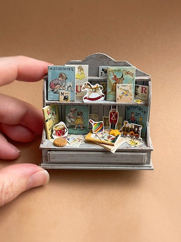 微型兒童套裝,包括娃娃屋和玩偶遊戲,尺寸為 1:12。套裝包括一個裝滿兒童書籍、玩具和裝飾品的微型波爾卡,所有物品都用膠水固定。製作材料為聚合物塑膠、壓克力顏料、壓克力清漆和紙板。價格為1件。