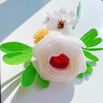主花花毛莨Ranunculus,又名洋牡丹、陸蓮花。洋牡丹的花語是令人無法抵擋受歡迎的迷人魅力。配色使用了白色讓人很有清爽感,其形象是光、純潔、樸素、高雅等,而白色可以搭配任何色系,表現出明快和調和其它色系使之更為顯色。但由於白色也容易給人不易親近、高冷的感覺,於是在配色上蕊芯使用橙紅色,整體營造出熱情温暖而富有愛之意。生活上以小小的花束裝點,工作桌或家裡的任何位置,在空間中增填美麗色彩。 3D立體紙花花藝,居家擺設裝飾用。商品內容:花毛莨6x6cmx5cm、3朵小花、中世紀銀杏葉。商品尺寸:13cmx23cmx5.5cm。外盒尺寸:14cmx25cmx5cm。備註: 1. 可提供小卡片(W9xH6cm)書寫英文節日祝賀語,如Happy Birthday、Mother's Day、Teachers' Day、Valentine's Day⋯⋯等,若有需要請在預定時,留言告知。 2. 可客製樣式色系,亦可客製其他大小,歡迎詢問。注意:此為紙花花藝,請勿噴灑或加水。此商品為手工製件,花朵不會一模一樣,若不能接受請物購買。