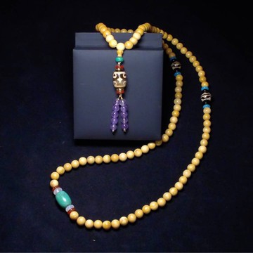 十字蓮花達洛天珠 雙虎牙天珠 綠松石佛珠 108顆黃楊木念珠