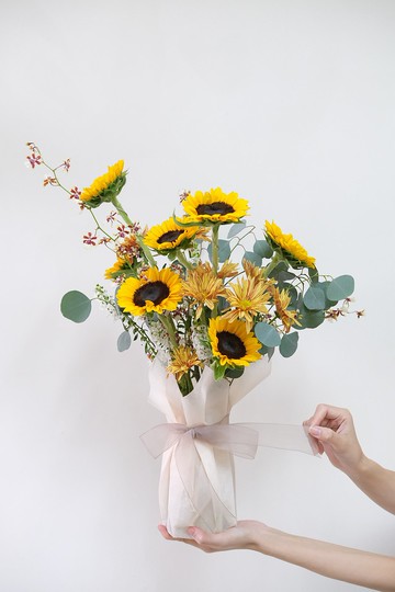 玫瑰浪漫是一時,向日葵的開心,更長久未來的日子,無論季節更迭我都會為自己與心愛的家人帶上一束,如太陽般明朗、快樂的向日葵🌻Instagram | withflowerdesignFacebook | 薇思花藝|The day with flowers🏷運送及訂購須知》本商品為「接單訂製」。付款後,從開始製作到寄出商品為3-6個工作天。(不包含假日)請先訊息討論後下單》周一至五歡迎自取:捷運南港展覽館站》雙北歡迎使用lalamove服務。》此款為鮮花花束,建議自取或雙北專人配送》雙北配送依區域報價 台北市$300up,新北市$400up請先訊息討論再下單✨鮮花無法寄國外。》設計館符合免辦理營業登記,無需開立統一發票。🏷注意事項 》此商品不含花器》花的姿態、顏色深淺皆不相同,每一束花都是獨一無二,與照片不會完全相同。》主花為向日葵,其餘花材由設計師依「當季花材」調整搭配,7朵向日葵+2-3種配花及葉,會「盡量」挑選與圖片中相同