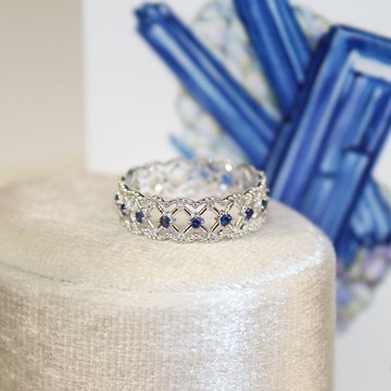 市面罕有的雕花蕾絲永恆戒整個戒圈皆鑲嵌天然藍寶石與鑽石除了目前展示的白 K 金版本也可訂製金色/玫瑰金色,請於下單備註欄註明要訂製哪個顏色~鏤空的蕾絲設計減輕負擔戴在手上輕盈又細緻戒身是 75% 黃金含量的 18k 戒指嚴選最高品質的天然藍寶石,舉手投足之間都讓你閃閃發光※ 依照戒圍訂製,下單前請先傳訊息與設計師確認訂製規格【產品規格】🔸 0.4-0.6克拉天然藍寶石🔸 配鑽: 共約 0.08-0.15 克拉🔸 材質: 18K金、藍寶石🔸 依戒圍訂製 (國際圍)- 此款無法改戒圍,下單前請務必先私訊設計師※ 若無法確認戒圍,請加購戒圍圈 1 組 ($250)若沒有加購戒圍圈而有尺寸不合之情形,不得退換貨,敬請見諒【製造地】台灣製/ 手工製作【購物須知】下單前請先詳閱✦ 部分產品為「現貨」作品,下午2點前下單並完成付款,可於當日寄出✦ 若無現貨則需「訂製」,請私訊詢問作品訂製工作天數✦ 本設計館使用天然鑽石、寶石,產品售出皆會附上保證小卡✦ 買方若需開立第三方鑑定機構之寶石鑑定書,可協助代送指定鑑定機構,鑑定費用需由買方自行負擔,詳情請私訊詢問✦ 天然寶石可能有內含物、包裹體或微小礦缺,但每顆寶石都是大自然獨一無二的產物,麻煩可接受者再下單✦ 售出作品如需退貨,請以完整包裝寄回。出貨前設計師會先拍照記錄作品狀態。若已經使用配戴、損壞,將無法退貨【注意事項】✦ 所有作品均以實物拍攝,因環境、光線以及不同顯示器可能有色差,部分照片與實物可能產生些微色差,請以實物為主✦ 下單前,請先詳閱產品規格、購物須知,如需修改尺寸,請私訊聯繫我們【客製化服務】✦ 提供客製化珠寶設計服務,歡迎私訊了解細節✦ 提供客製化刻字服務,以英數字8個字以內效果較好。下單時請務必備註您的刻字內容,一旦確認完成即無法再更改【售後服務】✦ 享有優惠改圍服務,以國際圍 ±2號為限,超過需酌收費用。改圍需約3個工作天 (部分商品無法修改戒圍,請私訊聯繫)✦ 提供珠寶清潔 (免費)、保養及諮詢等服務✦ 提供作品整新、維修等售後服務,依服務項目回報費用【保養須知】✦ 每一件珠寶首飾請單獨存放,避免碰觸、摩擦而產生的損傷✦ 在從事運動、洗澡、泡溫泉...等其他可能損傷珠寶的活動時,請先取下配戴的首飾✦ 配戴珠寶時,避免與其他珠寶、尖銳之金屬物品,或香水、酒精、化妝品...等含有化學成分產品相互接觸,盡量於上妝後再配戴首飾✦ 養成良好的配戴習慣-將首飾取下後,若想清潔保養,請以清水或是清水加入少許中性清潔劑,再用軟毛刷清洗。洗淨後使用柔軟的棉布輕輕擦拭,並放置於軟布上陰乾