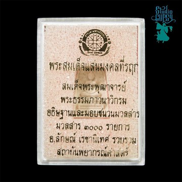澤被萬物 (紀念) 農業符咒背面 標準之星 (好運)功德主佛 (聖粉佛像,神聖粉末聖物)背面鑲有銅牌 農業符咒 佔星學院由佔星家阿叻(Aj. Lak)於佛曆 2554 年(西元 2011 年)督造- 澤被萬物佛 尺寸 1.4X2 公分帕崇迪帕猜 (Phra Somdej PhutthaJarn) 和 帕塔瑪帕瓦那維庫 (Phra DhammaPawanavigrom) 舉行灑淨儀式並贈予 3,000 種混合聖料,由佔星家阿叻(Aj. Lak)收集澤被萬物佛 (Phra Somdej Saen Lan) 採用了佛曆 2550 年(西元 2007 年)鑄造 Jatukam Ramathep 的混合聖料。佔星家阿叻(Aj. Lak)在曼谷三頭龍寺 (Wat Traimit Wittayaram Worawihan)、曼谷萱律武裡大佛寺 (Wat Phra Sri Mahathat Bang Khen) 的大殿中,以及在 Ngamwongwan The Mall 的 MCC Hall 現場,於眾多民眾和媒體的見證下進行了混合聖料儀式。數千民眾到場見證。其中重要的聖料包括:佛曆 2530 年(西元 1987 年)第一期 Jatukam Ramathep 冠軍品相聖物、以及價值數千萬泰銖的巴黎錢幣博物館 (Monnaie de Paris) 系列鎏金 Jatukam Ramathep 一對。這些聖物彙集了數十億泰銖的珍貴聖料,帶來了神聖的加持力量。聖料彙集了來自世界各地的珍貴聖物。佔星家阿叻(Aj. Lak)親自前往國內外收集了多種神聖聖料,包括:九種神聖木材的木粉、來自全國各地古老寺廟的香灰粉末、來自佛教聖地的聖土、以及從高僧大德處獲得的神聖聖料,例如:帕崇迪帕猜(Chao Khun Kieow Upathasen)、帕塔瑪帕瓦那維庫(Chao Khun Thongchai Wat Traimit),以及來自信眾的捐贈。總計超過 3,000 種混合聖料。九種吉祥木材的粉末1. 銅錢樹 (Ratchaphruek):象徵權力與財富2. 繁殖樹 (Khanun):象徵不斷的成長、財富豐盛、獲得幫助與支持3. 勝利樹 (Chaiyaphruek):象徵好運、勝利、戰勝敵人與克服困難4. 扁擔樹 (Thonglang):象徵財富與儲蓄,擺脫貧困5. 喜樂竹 (Phai Si Suk):象徵身心愉悅,遠離憂愁、疾病與災禍6. 亞馬遜樹 (Song Badarn):象徵穩定,使家宅安固7. 柚木 (Sak):象徵尊嚴、聲望、權威與受人敬仰8. 紫檀木 (Phayung):象徵提升和穩固社會地位9. 龍血樹 (Kanprao):象徵防護各種災禍,又名「撐柱」,象徵使房屋的柱子更加堅固由神聖儀式加持過的古代泰國聖土粉末、以及用於修復神聖佛像的純金、純銀屑。因此,此批澤被萬物佛融入了金屬混合物,並帶有不同金屬的鏽跡。其中還包含來自烏塔拉迪特府的帕納姆菲 (Phanom Phi) 鐵粉、布羅浮屠 (Borobudur) 的火山土、以及由黑樹製成的黑色佛像。被視為擁有無數歷史悠久的神聖聖料的吉祥聖物。擁有並供奉此聖物,將能獲得神聖聖料的能量庇佑與守護。澤被萬物佛的功德力將引導您獲得財富。佛曆 2554 年(西元 2011 年),澤被萬物佛 (Phra Somdej Saen) 和 澤被萬物佛 (Phra Somdej Saen Lan) 參與了曼谷大皇宮、泰國春武裡府 (Chachoengsao) 索通寺 (Wat Sothon Wararam Worawihan)、泰國農開府 (Nong Khai) 帕猜寺 (Wat Phothichai)、泰國洛坤府 (Nakhon Si Thammarat) 佛統寺 (Wat Phra Sri Rattana Mahathat) 和泰國彭世洛府 (Phitsanulok) 彭世洛大佛寺 (Wat Phra Sri Mahathat Woramahawihan) 的本吉佛陀帕提漢 (Benjaputtipatiharn) 聖典「帕貼拉卡」(Phra Thep Raksa) 系列的特別加持法會。澤被萬物佛 (Phra Somdej Saen) 參與的特別加持法會:1. 佛曆 2554 年(西元 2011 年)12 月 31 日:跨年祈福法會暨羅侯神騎鳳凰供奉儀式,於泰國暖武裡府 (Nonthaburi) 雙和寺 (Wat Buakhwan)。2. 佛曆 2555 年(西元 2012 年)1 月 14-15 日:延壽消災法會暨混合聖料佛陀天神加持法會,於泰國南奔府 (Lamphun) 帕塔特哈裡普恩察伊寺 (Wat Phra That Hariphunchai)。澤被萬物佛 (Phra Somdej Saen) 參與的佛陀天神加持法會:1. 曼谷三頭龍寺 (Wat Traimit Wittayaram Worawihan)。2. 泰國南奔府 (Lamphun) 帕塔特哈裡普恩察伊寺 (Wat Phra That Hariphunchai)。3. 泰國清邁府 (Chiang Mai) 班登寺 (Wat Ban Den)。