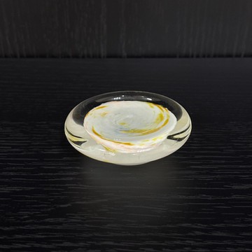 這件作品僅高約2公分、寬約6.5公分,重量127克,為低矮扁平型玻璃飾品。中心略有高起,表面平整光滑,內部微泛黃光,在光線斜射時會出現淡淡層次感。很適合搭配其他高低錯落的小物件,作為視覺收尾或平衡用途。