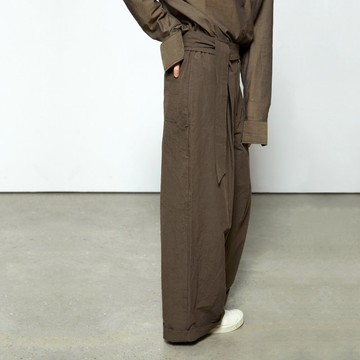 棕綠棉麻半松緊束腰大廓形直筒口袋休閒百搭闊腿長褲 杲果GAOGUO