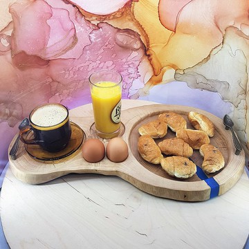 用於在床上供應歐陸式早餐的灰盤,帶有用於存放糕點、果汁、咖啡或茶和兩個雞蛋的隔間。原裝手柄,矽膠腳。 填充藍色環氧樹脂。 油塗層用於與食物接觸。尺寸 51x27 厘米,帶把手的高度 5.5 厘米,重量 1.6 公斤。