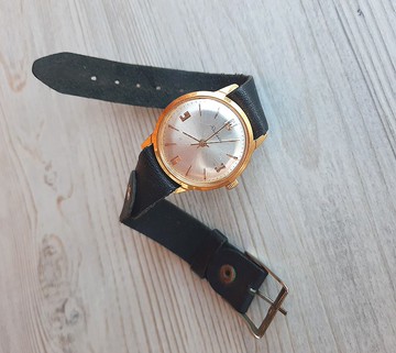 機芯 2609.1 - 26 毫米口徑,高 4.5 毫米,17 顆紅寶石,秒針,防震平衡輪,36 小時上滿鏈彈簧。精度 -20.....+40 秒。錶殼為圓形,鍍金(AU10-),帶有防塵表扣。錶盤鍍銀,放射狀。數字和小時標誌採用浮雕設計,呈金色。刻度和銘文是黑色印刷的。鍍金表針。在最後的照片中,您可以看到 1975 年手錶目錄中類似型號的蘇聯男士手錶 Raketa。“Raketa”(火箭)是 Petrodvorets 鐘錶廠生產的手錶品牌——俄羅斯最古老的工廠之一。該公司是蘇聯13家最大的鐘錶廠之一,大量生產自用手錶。 “Petrodvorets 生產的 Raketa 手錶已出口到全球 30 多個國家。“Raketa”品牌的第一批手錶製作於1961年,品牌以加加林的飛行命名,但在西歐和美國,這個名字更多地與蘇聯導彈武器聯繫在一起。良好的工作狀態。正確使用手錶:為延長手錶的使用壽命,每天大約在同一時間為手錶上弦是必要的。您應該將手錶按鈕旋轉到盡頭,但要非常輕柔(!!),直到過程變緊,以免扭曲它。