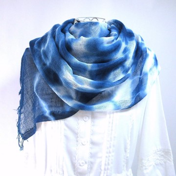 藍染・蚊帳織・紮染_3 閃耀的波浪・大尺寸棉質長披肩