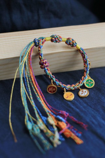 普陀說:善待自己,不生氣,不取悅,不拿別人的錯誤懲罰自己。淺淺笑,穩穩走,看淡得失,珍惜擁有,不負時光,不負自己。全手工精編手繩,客製款。全手工精編 | 藏式琺 琅彩沙金五路財神手繩 | 祈福彩色手繩**五彩閃耀 財神時刻相伴****唐卡佛眼 收盡五方之財**五路財神,又名「五色財神」,涵蓋黃、白、紅、黑、綠五種顏色的財神,象徵著吸收來自東南西北中五個方位的財富與福祉,是迎祥納福、招財進寶的象徵。材質:琺琅彩沙金五路財神(銅鍍24k金)+手搓棉繩工藝:四股辮+六股編+八股編+蓮花結+玉米結+鳳尾結+金剛結規格:主繩粗約8~9mm,可調節。祝福平安,吉祥如意。接單客製款,下單前,請確認可以等待,並接受無法避免的手工痕跡。感謝!> 春耕秋收這世間但凡舒展,但凡詩意,但凡美好之事,往往都只會自然發生,就像四季輪轉。學著慢下來,澄空自己,柔軟地對待生活,敬畏時間的力量,讓一切可以自然生長,像樹那樣,專注而不畏懼地,生長出清晰的年輪。我們的手工亦是如此!!> 保養1. 避免腐蝕,避火。2. 不可化工漂洗。3. 不可長時間用水浸泡。4. 不可刷、磨、搓、挑。5. 弄髒後,可用普通濕巾擦拭,或清水正常輕柔洗滌,自然晾乾即可。