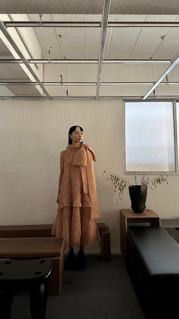 無袖上衣綴以蝴蝶結設計,搭配荷葉邊剪裁的雪紡百褶長裙