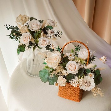 【採客製化設計,歡迎洽詢客服討論】此套組含捧花一束 (大小約28-30cm)、藤編竹籃花 (約30x30cm)特別適合作為婚紗用途,可以拍出清新的韓風感。讓不知道怎麼擺姿勢的新人們,有更多道具可以互動唷!-以下為示範成品照https://cdn.store-assets.com/s/824498/f/9403367.jpghttps://cdn.store-assets.com/s/824498/f/9403366.jpghttps://cdn.store-assets.com/s/824498/f/9403368.jpg商品詳細資訊:材質:永生玫瑰數朵、索拉花束朵、乾燥花https://cdn.store-assets.com/s/824498/f/7680345.png-照護方式:1. 避免陽光直射2. 不須澆水3. 放置陰涼乾燥處4. 潮濕時放進除溼房除溼好好照顧的話,即可擺放2-3年唷-注意事項:1. 花禮訂製僅有主要花材配色不變,其餘搭配花葉材則會因季節更替有所變動。2. 花葉材偶有輕微破損屬自然現象,不得視為瑕疵退貨 3. 物流如遇天災、國定假日造成延遲,請依實際到貨時間為準-製作天數:以下單日起算往後推2-3天出貨,物流約1-2天 (郵局六日不配送、黑貓週日不配送)。如有24小時內出貨需求,請洽客服詢問,視檔期酌收急單費用。-| 什麼是永生花?|永生花是由鮮花經過特殊處理後製成的花材,可保有鮮花般的觸感與顏色,並可長期存放約2-3年,不須澆水照顧,因此可作為送禮的好選項。-| 甚麼是索拉花?|索拉花是由索拉樹的樹皮或者通草人工製成的花,因植物纖維的緣故,可吸收精油在揮發至空氣中,因此也可當作擴香使用,是美感實用兼具的材料。