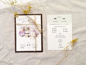 https://live.staticflickr.com/65535/50315768611_ed55b6af24_b.jpg一起旅行到世界末日我們一起去想去的地方我們一起過想過的生活我們一起在這個世界牽手走過這趟旅行,直到世界末日。https://live.staticflickr.com/65535/50315769446_c0b1449d75_b.jpg.一起旅行到世界末日水彩插畫喜帖.直到世界末日前,我們都會一同攜手前進。-什麼是公版喜帖-公版喜帖-製作時間相對客製化來的短,省時,費用也較為經濟實惠,新人只需提供婚期資訊就能直接幫您印刷完成。是個不想要耗神費力的好選擇https://live.staticflickr.com/65535/50315102353_25256aa271_b.jpg紙張上我們選擇的是285P星幻紙,拿在手上有一點分量喔!紙張的顏色有一點點偏黃,看起來更溫潤有質感,低調卻不失典雅。https://live.staticflickr.com/65535/50315950932_9e7be4d3a9_b.jpg封面上的浪漫的旅行車就是出自於WUWU老師之手。https://live.staticflickr.com/65535/50315101178_d0f2c3e6c5_b.jpg喜帖的正面可以放上你們的名字,即使是公版卻仍專屬於你們。https://live.staticflickr.com/65535/50315952552_a877ed793d_b.jpghttps://live.staticflickr.com/65535/50315768001_0dc9cb3d73_b.jpg喜帖的背面是對視的貓咪新人,讓喜帖更顯得活潑。https://live.staticflickr.com/65535/49966773067_563968f52c_b.jpghttps://live.staticflickr.com/65535/49966875191_c3e65733b2_b.jpg封口貼是嗚嗚老師精美的水彩花圈作品。https://live.staticflickr.com/65535/49682840336_f2b0ea4d65_b.jpg當然,也可以客製化換成你們的專屬人像插畫喔!!(2023年3月開始,恢復客製專屬人像插畫了喔~)商品詳細說明:規格:每份含一張明信片邀請卡、25K空白信封(紫羅蘭.可可金.牛皮.粉紅.古銅.海洋綠.玫瑰紅.白金點艷紅)、封口貼紙備註:1.若需要加購地址燙金的話費用需與設計師另外討論2.可加價換購莫蘭迪色系信封(一個加12元)3.加購電子檔250元3.更改內文不收費,更改編排等等酌收美編費用100起(依內容複雜度)喜帖尺寸:10.5cm x 14.8cm 材質:星幻紙285P產地:台灣款式:此款為紫色點點款,下單前請先再確認一次。公版喜帖訂製說明:下單後請和我們聯絡,將你們的婚期資訊傳達給我們,討論後約14個工作天會完成印刷。客製新人頭像插畫說明:下單後請和我們聯絡,將你們的婚期資訊和你們正面清晰的照片1-2張傳給我們,討論後會先畫草稿和新人確認後開始作業,作業時間約7個工作天,完稿後雙方確認無誤約14個工作天會完成印刷寄出。
