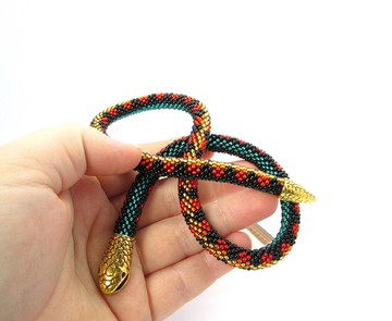 奇妙的神秘卡特蛇 - 為夢幻和神秘事物的粉絲準備的手鍊。印花、蛇紋、蟒蛇的使用仍然很流行。它總是看起來時尚而時尚。手鍊項鍊由 11/0 尺寸的優質日本珠子和捷克珠子 - 紅色、黑色、綠松石色製成。手鍊項鍊配有方便的蛇頭和蛇尾扣環。項鍊或手鍊是通用的,它可以作為手鍊或短項鍊兩圈使用。您也可以根據需要製作任何長度或顏色。給我發電子郵件。---厚度 - 0.2 英寸