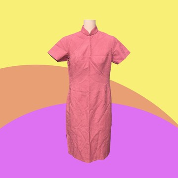 二手 古董訂製 桃色 葉片印花 輕薄 短袖 旗袍 CA801