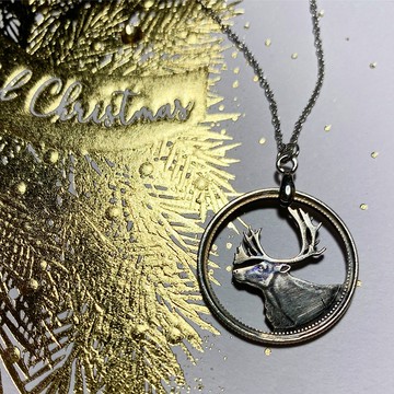 馴鹿是加拿大的代表動物,也是聖誕老公公的得力助手。宅們溫馴可愛,又刻苦耐勞,生活於冰天雪地的野外依然應付自如,硬幣上就是記載著這種美麗。***硬幣鍊咀以人手切割,其精準度之高,非一般工廠製貨品能比擬。***請提供所須項鍊長度,如未能提供,項鍊長度為18英吋(45厘米)。