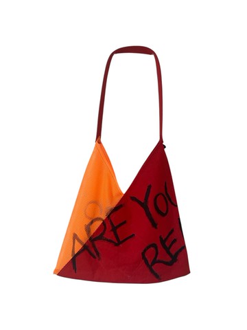一款能為玩味穿搭增添亮點的包包誕生了。修長俐落的三角造型,結合紅與橘的活力配色,散發滿滿能量感。大膽印上的字樣拋出問題:你的答案是 YES or NO??文字為手寫設計。僅此一件。附外袋。尺寸底寬 40cm 高 24cm~37cm 提把長 50cm 提把寬 3cm材質 棉、麻、聚酯纖維保養方式・請注意避免網眼材質被勾到或拉扯。・摩擦可能導致染色轉移。・可清洗,但可能會有些微褪色。・清洗時請放入洗衣袋,並避免與其他衣物摩擦或磨擦。