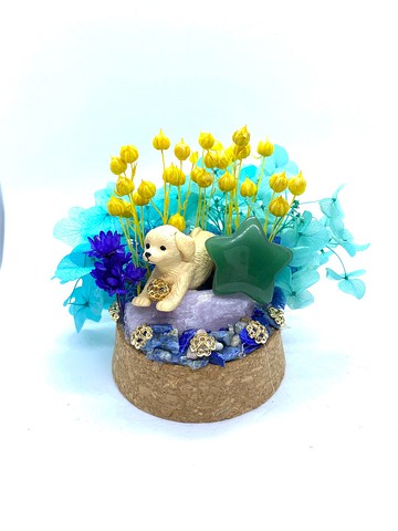 淡藍花園-拉布拉多與綠東陵星星/紫鋰輝石綠東陵東陵石又稱「印度玉」,為含鉻雲母的油綠石英巖,其色很美。東菱玉有療癒心靈傷口、良善本質的能量紫鋰輝石紫鋰輝石的主要特性是能溫和地平衡與促通能量,其溫和柔潤,能緩慢促進能量流轉,能促使人心境改變,情緒比較溫和而看得寬廣*****商品製作*****底台製作時是以藍紋石碎石鋪墊,藍紋石(又稱蘇打石) ,能使思緒清晰,提升判斷力及理解力,靈性上其深藍色能量厚實,能帶領入瞑想深層中,能提高個人意識,開發智慧。*****手作奧秘空間*****品牌故事:在每一個小玻璃空間中,不同的時空與背景,構成不同的故事,在不同的觀看者眼中,形成一個獨有的奧秘空間。商品理念:因為喜歡扭蛋,每當打開扭蛋外殼看到喜歡的公仔,就會想像著那個他自己的獨特空間,編織他們的故事,因此激發了想在小小的玻璃空間創造一個屬於他們的場景。*****內容物*****公仔:拉布拉多水晶底台:藍紋石水晶 : 綠東陵(星星)/紫鋰輝石馴鹿草永生苔蘚乾燥花 *****尺寸*****直徑10cm x 高度 10om x 口徑 7cm*****注意事項*****玻璃罩不建議經常打開。因其使用之材質(乾燥花及馴鹿草永生苔)較軟,打開玻璃罩會些許掉落。如打開玻璃罩需裝回可稍微內壓苔蘚處,以倒立的方向裝回,切勿太大力避免場景損毀。請注意以下事項 ^_^1.目前未提供客製化服務。2.每一項商品手工製作,只有一件。3.因為商品已製成,場景材質無法更換。IG:@eso.space7FB:@esoteric.space7