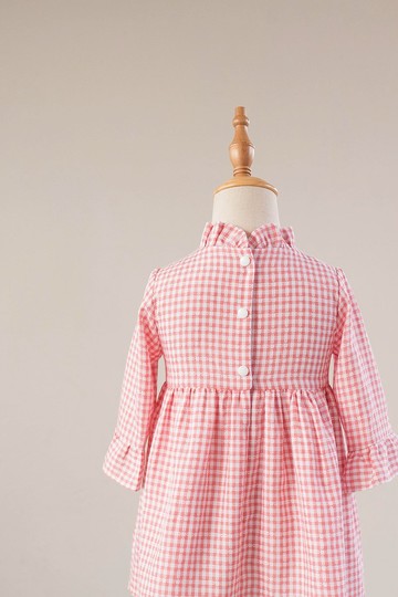 恬靜的米粉色格子布加上我很愛的荷葉邊領和淺色花邊下擺我家大女孩兒一直說好美好美布料雖然是混紡的,但手感極好用純棉的內裡增加一點厚度但又不至於太厚重,很適合秋冬一般的天氣材質:棉絛混紡,有純棉內裡尺寸:90-150碼