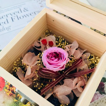 * 創作心情:因為愛花,喜歡花,希望 Aurora 的每一個作品, 都能帶給同樣喜歡花的你(妳), 幸福與感動的時刻* 花材 : 採用日本進口不凋玫瑰 , 繡球 ,小星花及 馴鹿苔 * 規格 : 木製禮盒 10cm (長 ) * 10cm (寛) * 10cm (高) * 注意事項 -採用都是天然花材,每一花材都有不同樣態,所以每個作品都會些微不同 -全館全數為客製化商品,皆無現貨, 於訂單確認後, 開始手工製作, 以確保花況 . 商品出貨, 恕無法接受退貨(客製化商品不受鑑賞期退貨限制) - 配合花材的時序,產季及進口因素, 設計師將保有調整花材之權利 , 但以不影響作品之整體呈現為原則 -不凋花均為人工染色( 部份乾燥花亦同) , 色差情況無可避免, 以實體物品為準, 請見諒 -花材極為脆弱嬌貴, 作品在出貨前均會儘其可能做最佳的保謢與包裝, 運送中難免會有些許掉落狀況,屬正常現象, 請見諒 * 保存方式 -絕對不要澆水 -避免潮濕及陽光直射 . 儘量放置於通乾燥的環境 ,可延長花材的保存期限與色澤 - 乾燥花為鮮花自然風乾處理,隨時間顏色會逐漸淡化 花材本身也會風化掉落, 屬正常現象 -不凋花均為人工染色,應維持放置的環境濕度於 60度以下, 建議勿放置靠於牆面, 窗簾 , 衣物等, 以避免染色 -若沾染灰塵 可使用柔軟的毛刷 輕輕撫拭清除積塵, 或以吹風機冷風輕吹亦可