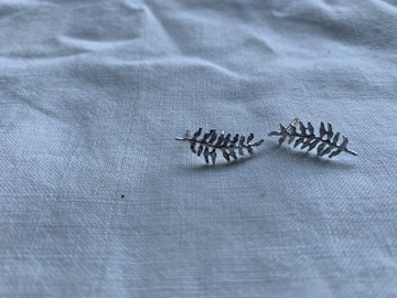 蕨葉圖案的耳環。由於刺穿的立柱部分上下顛倒地焊接在一起,因此葉子的方向在佩戴時會有所不同。材質:銀,黃銅