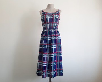 復古綠藍格紋中長洋裝 女款 格紋 吊帶 聚酯纖維 M號