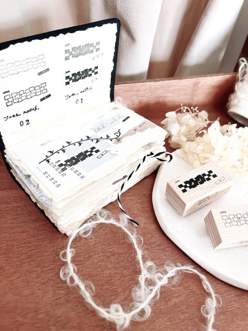 Take notes 手記系列 01、02源自於隨手記錄美好事物的想法取自筆記本的方格子的設計概念結合了印章陰刻、陽刻的表現形態誰說筆記紙只能橫橫直直四四方方呢?可以隨心所欲地作為拼貼打底使用也可以作為記錄日常的小小點綴在印畫上隨手寫上的重要時刻、心情或是簽個名:)都會非常凸顯出畫龍點睛的效果唷!360度旋轉都可以運用。雖然2款概念很相似,就像是孿生子一樣,但實際使用上的感覺卻是完全不同呢!可以參考圖中的印樣。