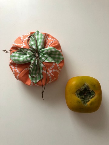 一個像柿子一樣的束帶袋。這是一種獨特的形狀,當你拉緊繩子時會讓你變平。可以收納智能手機充電線、耳機、糖果等稍大一點的物品。請放上你最喜歡的一個,和它一起走。