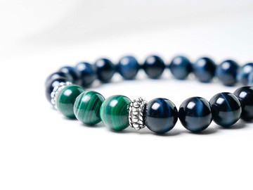 **【材質及尺寸】**◆孔雀石 約8MM ◆孔藍虎眼 約8MM ◆金屬配件 925純銀◆線材 日本進口彈力絲線**手鍊的設計會因尺寸大小而略有不同,會在手鍊的尾端增加或減少珠珠來做調整,以符合您的手圍大小****珠子大小因每批材料不同,尺寸會略有差距****【照片是否與實品完全相同 ?】**◆ 商品皆實物拍攝,但因每台顯示器顯色皆略有不同,且天然石每顆/每批紋理、色澤是獨一無二不會完全一模一樣,我們會儘量讓照片與實品相近,但無法與照片100%完全一致。◆手環採用天然水晶及礦石製作,每顆的紋理、結晶甚至色澤都不盡相同,製作時都會精心挑選,但天然水晶及礦石必定會存在有冰裂、棉絮、雜質等狀況,無法完美無瑕,完美主義者建議可至現場挑選~◆手鍊會依您的手圍大小做微調與設計,主要是在手鍊的尾端增加或減少珠珠來做調整,來符合您的手圍大小,所以不完全與照片相同喔。**【如何測量手圍】**確認手鍊要配戴的位置,在該處用軟尺不鬆不緊地的繞一圈,即可得到淨手圍的尺寸,【不用預留長度】,我們會根據款式及珠珠的大小再加上1-2.5公分來製作。***請謹慎測量手圍尺寸,下單尺寸為淨手圍的尺寸,不是手鍊長度的尺寸*****【多久出貨 】**付款後開始製作,約5個工作天出貨(不含假日),若提早製作完成會提早出貨,如有急件下單前可先詢問~**【特別注意事項】**◆ 客製化商品:每件商品都是下單後才手工製作的專屬客製商品,皆【無七天鑑賞期】,無退/換貨之服務,下單前請三思。◆商品都是下標後才客製,不接受與想像不同、色差、不適合、等主觀因素要求退/換貨。**【保養注意事項 】**◆ 脫戴時,請特別注意避免大力拉扯、碰撞。◆ 避免接觸化學物質、避免高溫。◆ 請儘量保持乾燥!!! 不戴時,請擦拭乾淨並密封保存。◆ 不建議戴著洗澡、泡溫泉、泡海水、噴香水或從事會大量流汗的運動。◆ 14KGF、925銀金屬配件,如有氧化顏色變暗可用拭銀布擦拭,即可回復光澤,如若氧化後長期置之不理,之後再行擦拭則效果會較差唷~◆ 良好的使用及保養習慣除了可以讓飾品維持在最佳狀態並可延長飾品壽命唷!◆ 線材是屬消耗品,需定期更換唷~在材料的挑選上都有特別選擇品質良好的品牌,相對來說是滿耐用的~但還是會依個人使用習慣與保養方式而有所不同~**【售後維修服務】** **來回運費由買家負擔**。◆收到手鍊如需修改尺寸,請於【一週內】與我們聯絡,可免費修改一次,**來回運費由買家負擔**。◆德國多股鋼絲線換線150元◆德國水晶線換線100元◆日本進口彈性線換線50元◆如缺少珠珠依種類及數量酌收費用,若該款珠珠已斷貨則無法維修