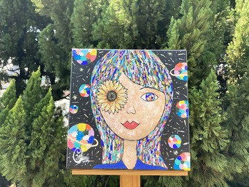 水瓶小姐《向日葵小眼睛》Miss Bottle "Little Sun Flower Eye" 20x20 cm 此系列的作品帶著一股童趣的風格,在趣味中又富含著各種象徵意義。作品由畫刀所繪製,因此可以看到極為粗曠的線條、色塊及紋路。畫面中有一位頭與身體並不合比例的女性,她的手好像藏起來的樣子,身體成一個水瓶形狀,這就是「水瓶小姐」一名的由來。這次水瓶小姐帶著花朵的眼睛來到童幻世界,與您一起遨遊幻想的天地。畫作有許多圖騰的表現方式,在水瓶小姐的四周充滿著宇宙的能量。銀白色的星球是皎潔的月亮,在黑暗的宇宙中點亮了整個世界,反射著點點繁星,傳遞滿滿的愛;散佈的彩色的小星球像是家人及朋友,靜靜地守候在我們身邊。系列畫作的每一幅作品用色都不同,就如同我們每一個人都著獨一無二的面容、個性及生命經驗。在我們的內心中都有一片屬於自己的小天地,那是一個私密的世界,像是一個小宇宙一樣,有著獨特運行的方式及規則。每一個人都像是一顆小星球,我們的審體由無數的小細胞所組成。如同宇宙中的星體,都是由不同的物質組成,構成了獨一無二的型態、狀態、顏色、光芒,在宇宙中散發著自己的光芒。尺寸:20x20 cm 媒材:畫布、壓克力顏料