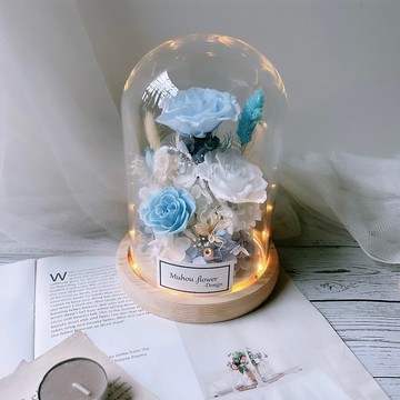永生花玻璃盅-莫蘭迪霧粉藍 l 小夜燈 日本玫瑰 情人節禮物