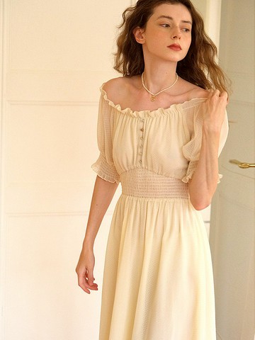 Mintcheese 法式優雅米杏植絨點點可露肩連衣裙長裙