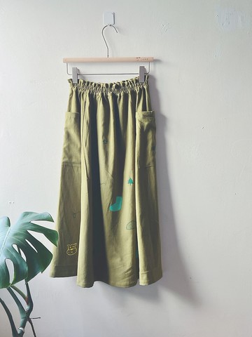 手作印花青草綠棉麻手工絹印鬆緊口袋裙 360度皆可穿