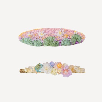 一套兩件的髮夾套裝,刺繡夾可愛,迷你花一字清秀動人,讓女孩不需要再在兩者之間作出選擇,兩者同時兼備!髮夾可以分開選購。Material | 材料Gold-Plated Metal Hair Clip | Handcrafted Resin Flower | UV Resin Hardening Coating | Swarovski Crystal | Pamycarie Original Patterned FabricFinishing | 加工Fading Resistant | Anti-allergy防脫色 | 防敏感Size | 大小Length : 12cm (H) x 11cm (W)Packaging | 包裝All products will be nicely and carefully packed in our wooden boxes.我們會備有精美木盒包裝 ,為產品提供最完善的保護。 Tailormade | 個人化訂造A complimentary 2-month warranty included in each purchase. Customization after purchase is welcomed. (size, length, etc.) Please visit our concept store to enjoy your warranty service. Address: Pamycarie, Shop 120, 1/F, K11, 18 Hanoi Road, Tsim Sha Tsui, Hong Kong客人購入作品後可享兩個月產品保養,歡迎親臨Pamycarie K11概念店進行長度/大小更改。 地址:香港九龍尖沙咀河內道18號K11 1樓120店鋪 11AM-930PMHandcrafted in Hong Kong | 產地香港 手工製作All products are made-to-order. Please note that each of the handcrafted products is unique and may slightly vary from website images. We will make sure to only deliver perfections to our customers. 所有作品均為接單訂製,請注意每件手製作品均為獨一無二,可能與相片有微小出入,但我們會確保把最完美的作品送到客人手上。Purchased item(s) will be shipped out within 10-14 business days. For urgent orders, please kindly contact us to check inventory before placing your orders. You may choose to pick up your parcel at our stores or have the parcel mailed by HK Post or SF Express. 作品會於下單後的10至14個工作天內完成並寄出。若希望查詢現貨/急件,請於下單前預先聯絡我們確認存貨量。客人可選擇親臨Pamycarie店自取作品,或是選擇香港郵政或順豐郵寄服務。後記Pamycarie 2022年的夏季系列,帶你走進印象中的夏日湖泊,感受安心、寧靜與綠意盎然。取荷花及睡蓮為引子,伴以木槿、鬱金香和紫藤花交織成一幅美麗畫卷。這次系列比起以過去作品用色更加大膽活潑,更挑戰了將剌繡工藝融合黏土花,巧妙地結合平面、浮雕以及立體結構,想要從第一眼開始就讓大家覺得「有點不一樣」。復古感的色調也是系列強調的元素,以及在各款作品中添加的半透明感,以有色琉璃和填充玻璃球模擬出窺探湖底風光的既視感。Pamycarie's 2022 Summer Collection takes you to the imaginary summery lake to get a taste of relief and serenity, as well as to be refreshed by the nature. The picturesque landscape features lotuses and water lilies as the theme flowers, while are further enriched by hibiscuses, tulips and purplevines. The brand aspires to impress the public with the sense of novelty. Compared to the previous launches, the 2022 Summer Collection not only uses a bold retro colour tone, but also incorporates embroidery into resin clay flowers, together creating a blend of plane, embossment and 3D structure. Elements such as coloured glazes and filled glass orbs are included to simulate the visual experience from the bottom of the lake.
