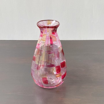 吹製的玻璃花瓶。淺粉粉紅、深粉粉紅、深紅色、橙將玻璃棒切成短的長度,垂直和水平排列,並在每塊玻璃棒上貼上烤盤。模製成水滴形狀。對於有色部件,將有色玻璃包裹在透明玻璃的外側。我又把透明玻璃包起來,然後把它拉伸成棒狀。裡面有一些小氣泡。(第三張照片)在第五張照片中,我插入了兩朵山繡球花(小花)。*其他網站也有販售,先到先得。請注意,萬一商品售完,該商品將取消。尺寸嘴內徑2cm x 屁股寬7.1cm x 底徑4.4cm x 高12.8cm 重量200g